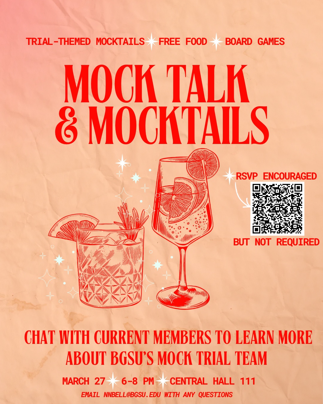 Socialize with current mock trial members over food, board games, and fun trial-themed mock tails! The event will be from 6-8 pm in Central Hall 111. Feel free to drop in-RSVP not required, but encouraged :) Stay up to date on other socials on our instagram @bgsu_mock_trial.