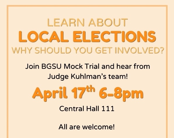 Listen to the team of Wood county judge, Judge Kuhlman, explain local elections and why it's important for YOU to get involved! The event will be Friday, April 17 6-8pm in Central Hall 111!