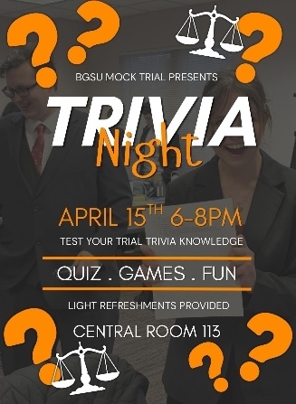 Socialize with current mock trial members over trivia! Light refreshments provided. The event will be Wednesday, April 15 from 6-8 pm in Central Hall 113. Feel free to drop in-no RSVP required :)