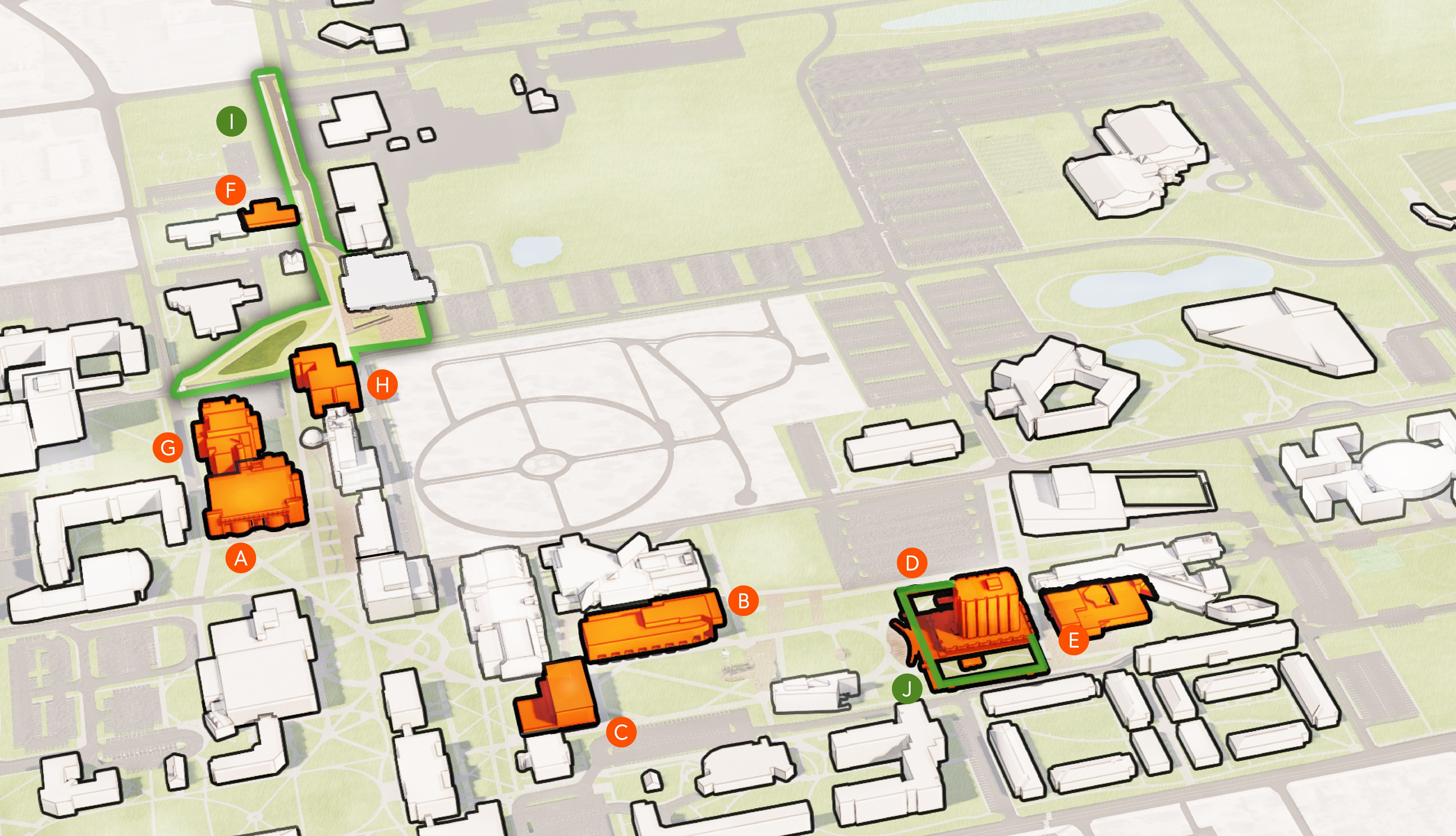 In the heart of campus, the University is repositioning the campus core through strategic asset repurposing and select facility removal. These actions are in-service of creating a reduced footprint, programmatically-focused and flexible academic and research environment. In addition, the Campus Master Plan recommends creating a more compact, walkable core retaining the historical character and charm of the original Traditions Quad.