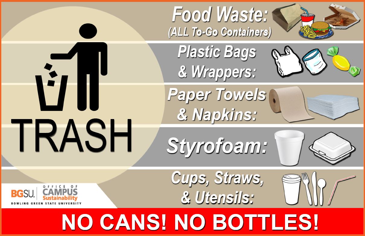 Recycling at BGSU is a great way to make a sustainable impact on campus, but some items cannot be recycled. Before recycling, make sure that the item is recyclable and that it does not contaminate the rest of the bin. Plastic bags can be disposed of only in the specially labeled containers found in the Student Union and Falcon Heights lobbies. One exception to the plastic bag rule is that if you wish to recycle shredded paper, it must be placed in a clear plastic bag. More common items that cannot be recycled are straws, Styrofoam, paper towels, tissues, food and food containers. Coffee cups are also a source of contamination and only the clear plastic drinking cups can be recycled. Cardboard is recyclable; however, be sure to place any cardboard in the large orange dumpsters marked “cardboard only.” For additional information on recycling and how to avoid contamination, visit our website. With your help, we can continue to reduce waste and encourage sustainability at BGSU.