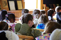 Since its dedication, school children who visit learn what it was like to attend a one-room school. During its years of operation, the enrollment of District #6 School ranged from eight to 37 students. Boys and girls entered through separate doors and sat on separate sides of the classroom. They even played in different areas during recess. Popular recess games included baseball, jump rope, crack the whip, fox and geese and pom-pom pullaway. When bad weather kept them inside, they played “Old Cat” and tic-tac-toe on the chalkboard, or gathered around the piano to sing.