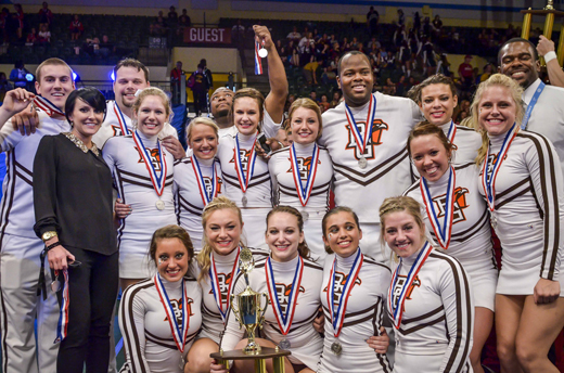 BOWLING GREEN, O.—The Bowling Green State University cheerleading team made history Jan. 19 during the 2013 Universal Cheerleading Association (UCA) College Cheerleading National Championship at the ESPN Wide World of Sports Complex in Orlando, Fla. The team finished second in the nation, which is the highest a Mid-American Conference school has ever placed.