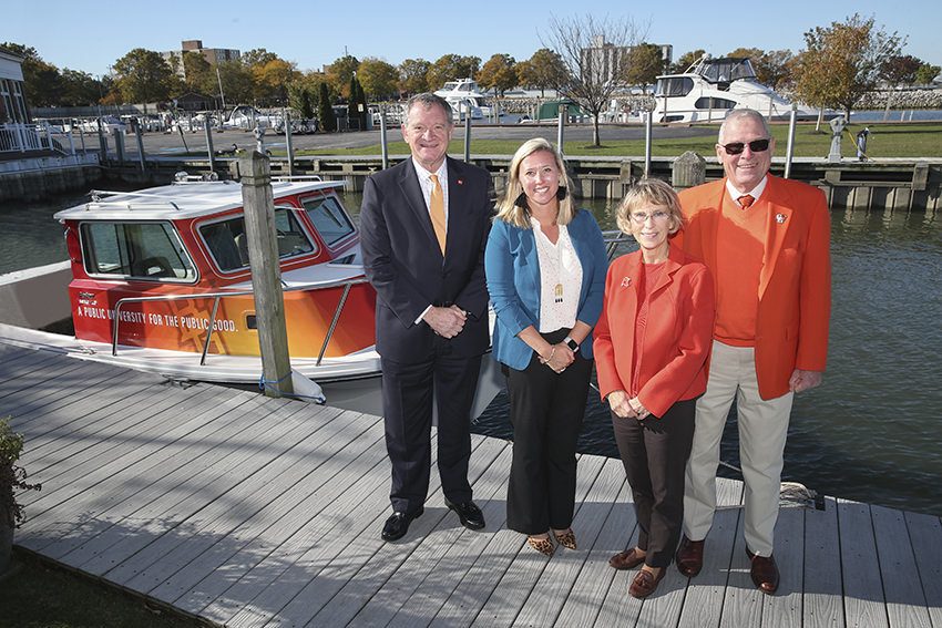 ryans ziggy boatBGSU President Rodney Rogers with Jennifer Ryan, Debra Scheetz Ryan and Patrick L. Ryan.Bowling Green State University christened a new research vessel Oct. 23 that will support the University’s water quality research efforts on Lake Erie through the Center for Great Lakes and Watershed Studies.