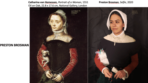 Students in the Northern European Renaissance Art History course studied self-portraits of that region’s Renaissance artists and used that knowledge and items they found at home while sheltering in place to create modern-day selfies.