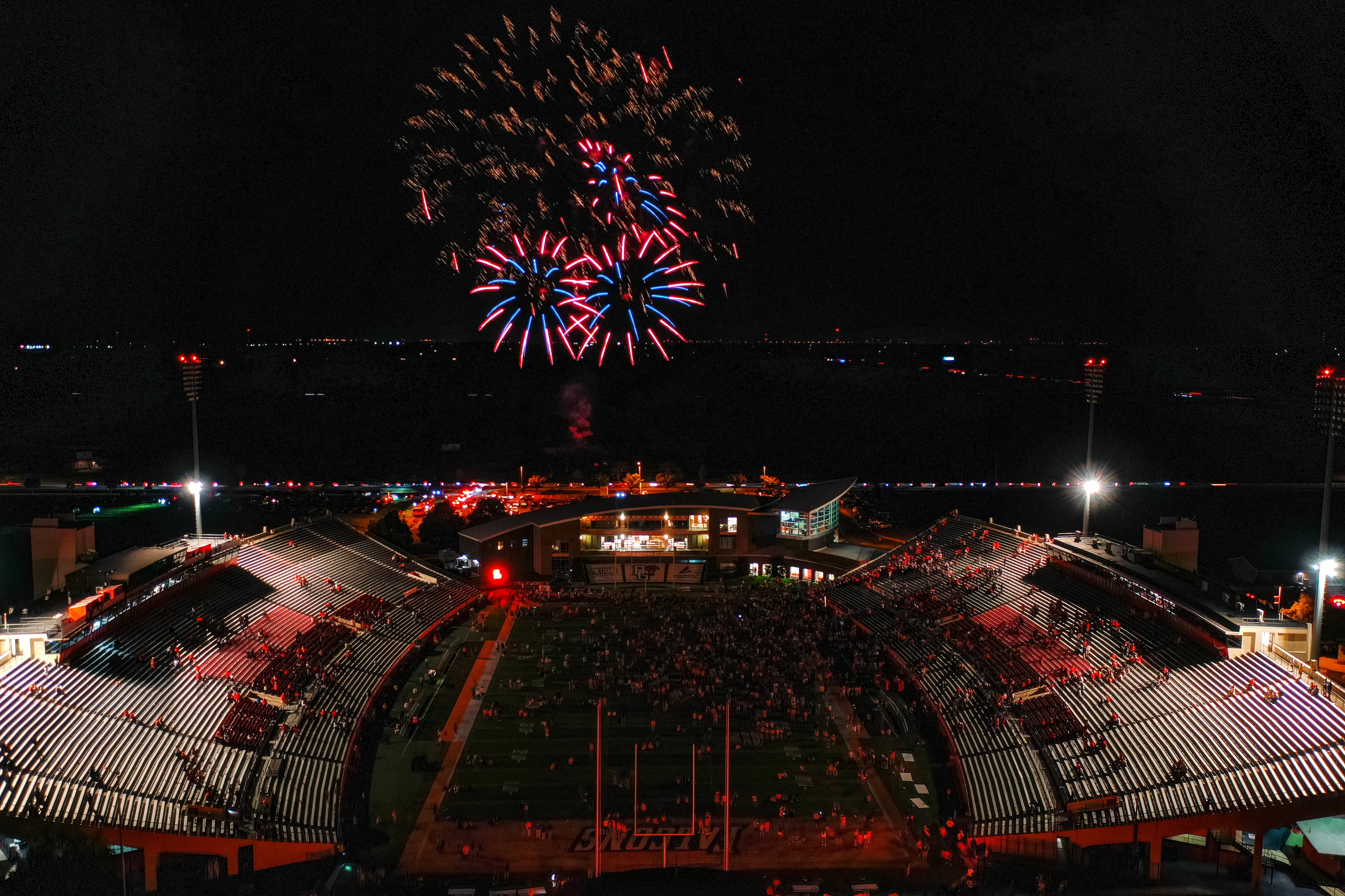 Fireworks thunder overhead at Doyt L. Perry stadium to cap off the 100th homecoming.