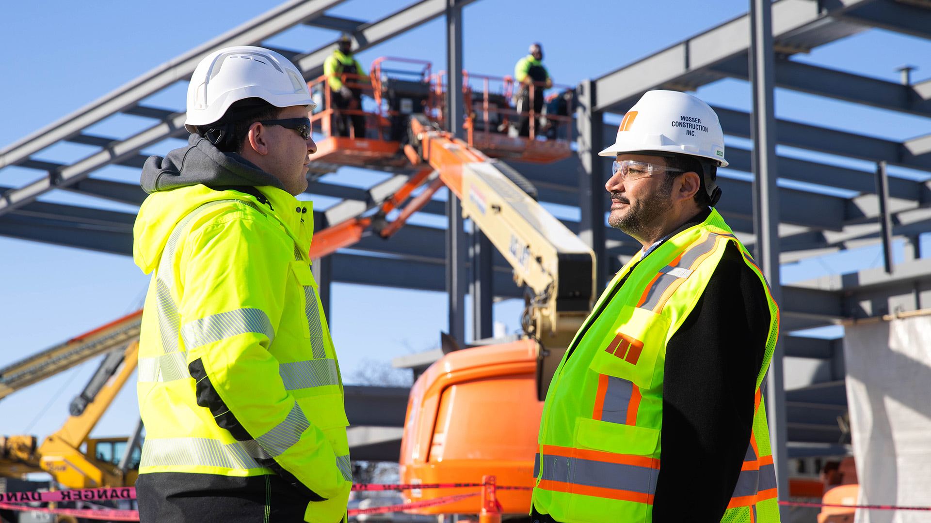 Ethan Schliesser talks with Dr. Wael Mokhtar, dean of the College of Engineering and Innovation, on the Technology Engineering Innovation Center job site. (BGSU photo/Daniel Carlson)