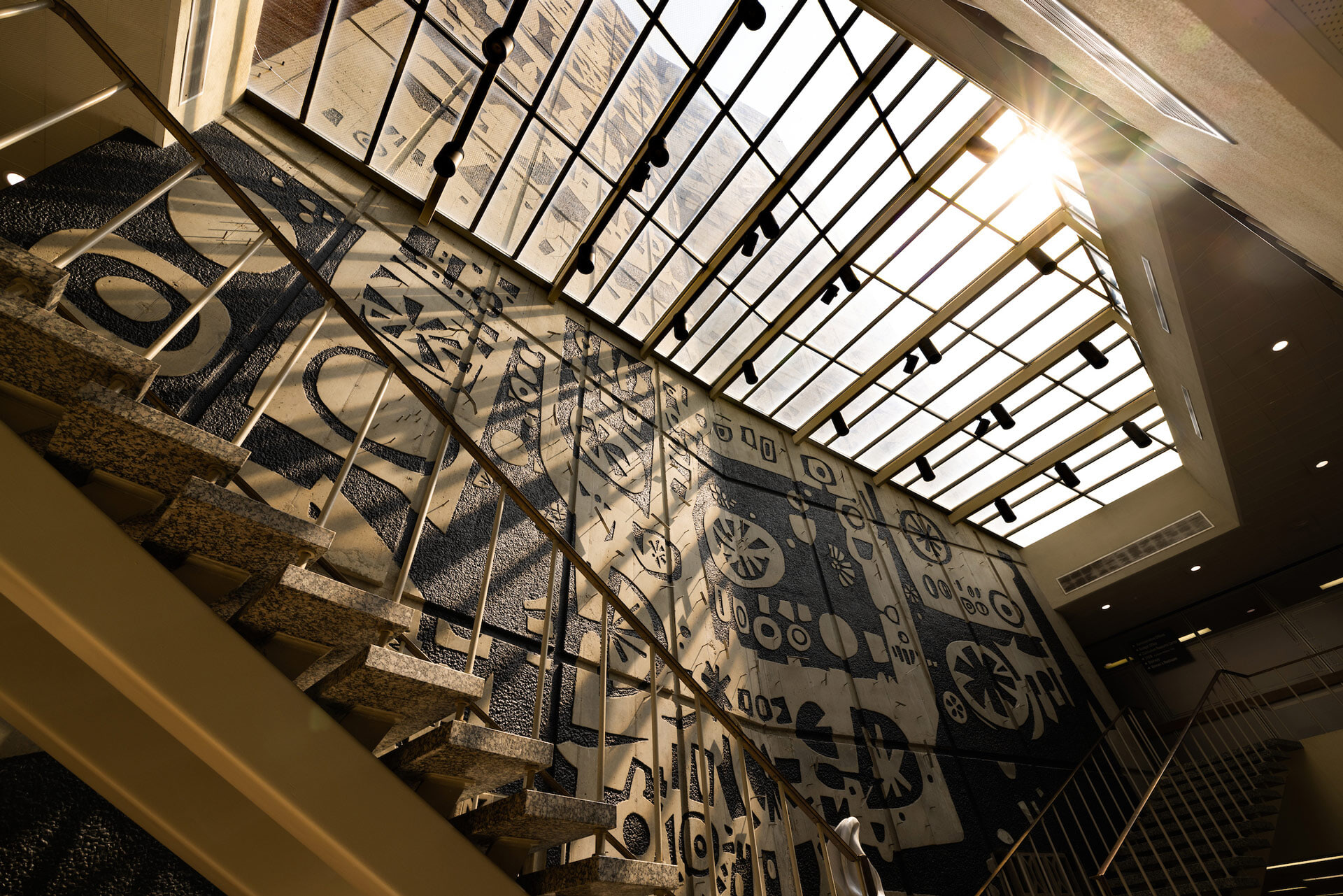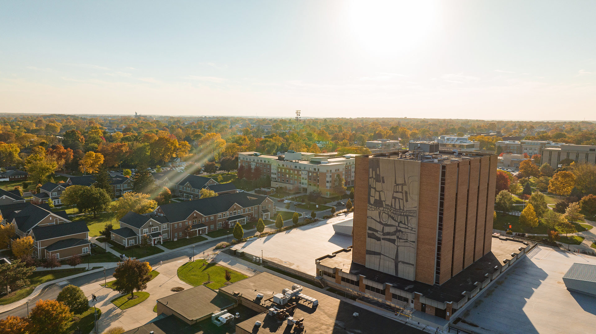 Spanning nine stories, the Jerome Library’s cherished mural is the largest piece of public artwork at BGSU. It was created by renowned BGSU artist-in-residence Donald Drumm after being commissioned in the summer of 1966.