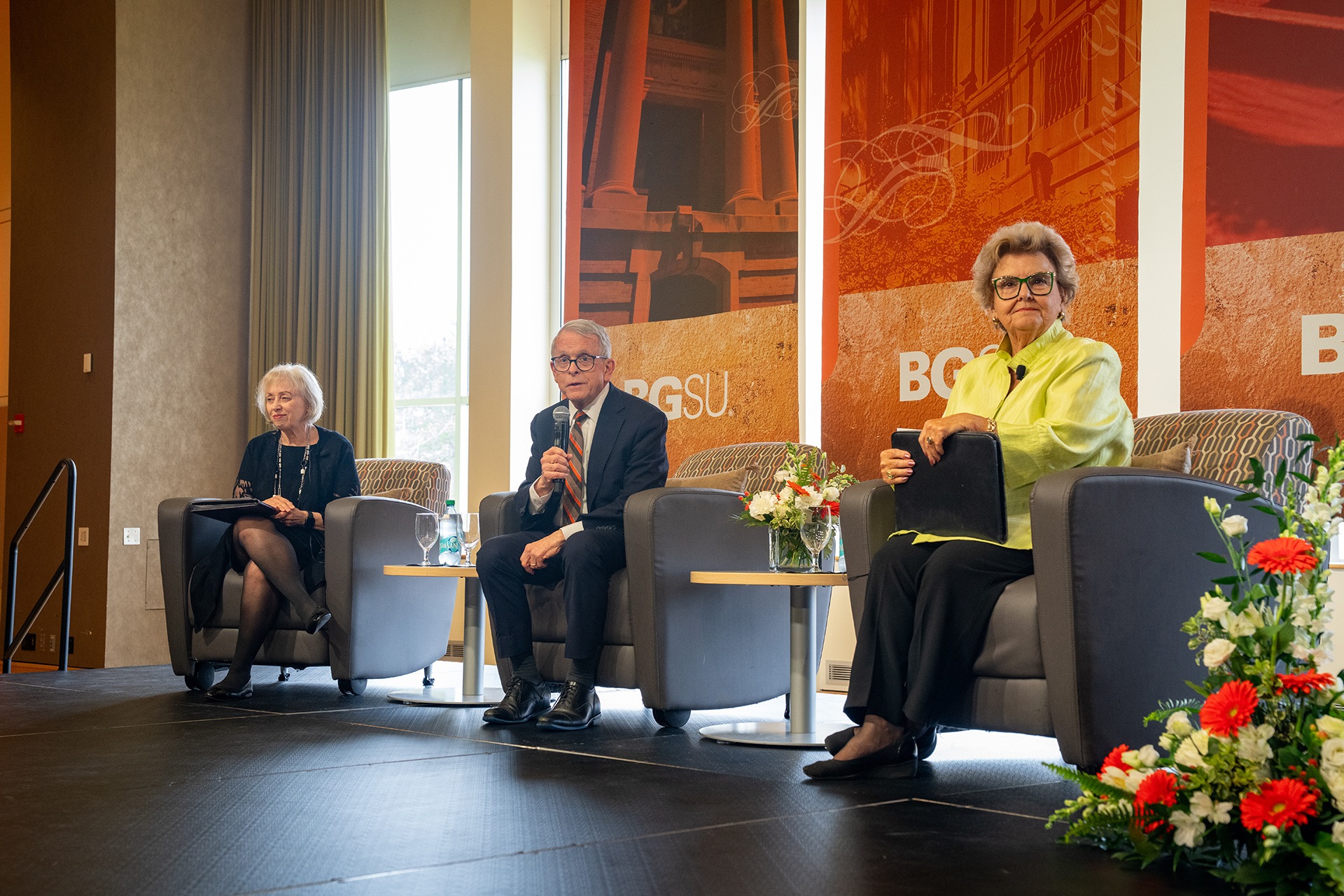 Ohio Gov. Mike DeWine shared the stage with former Attorney General Betty Montgomery '70 and former Democratic advisor Jan Allen.