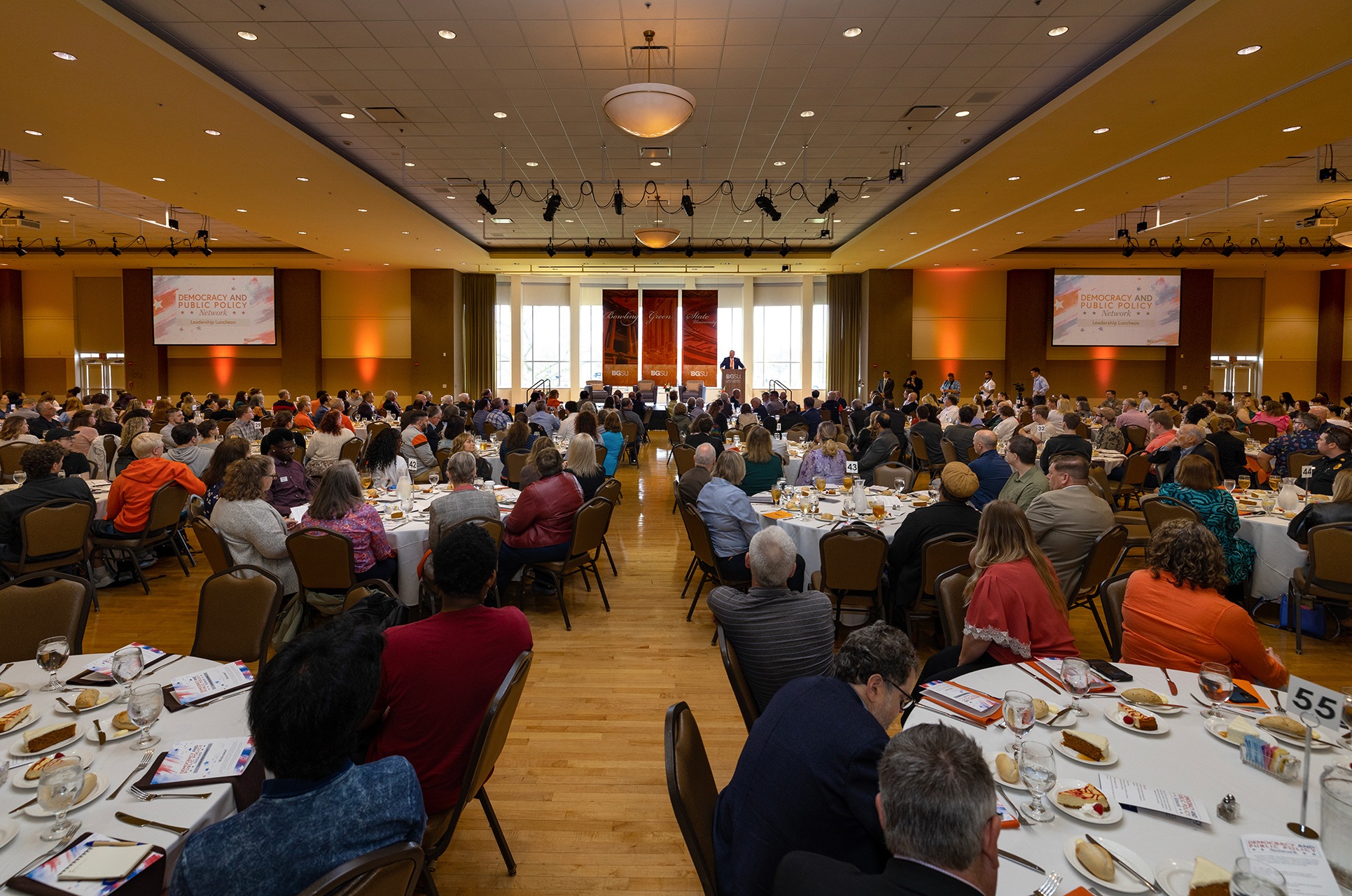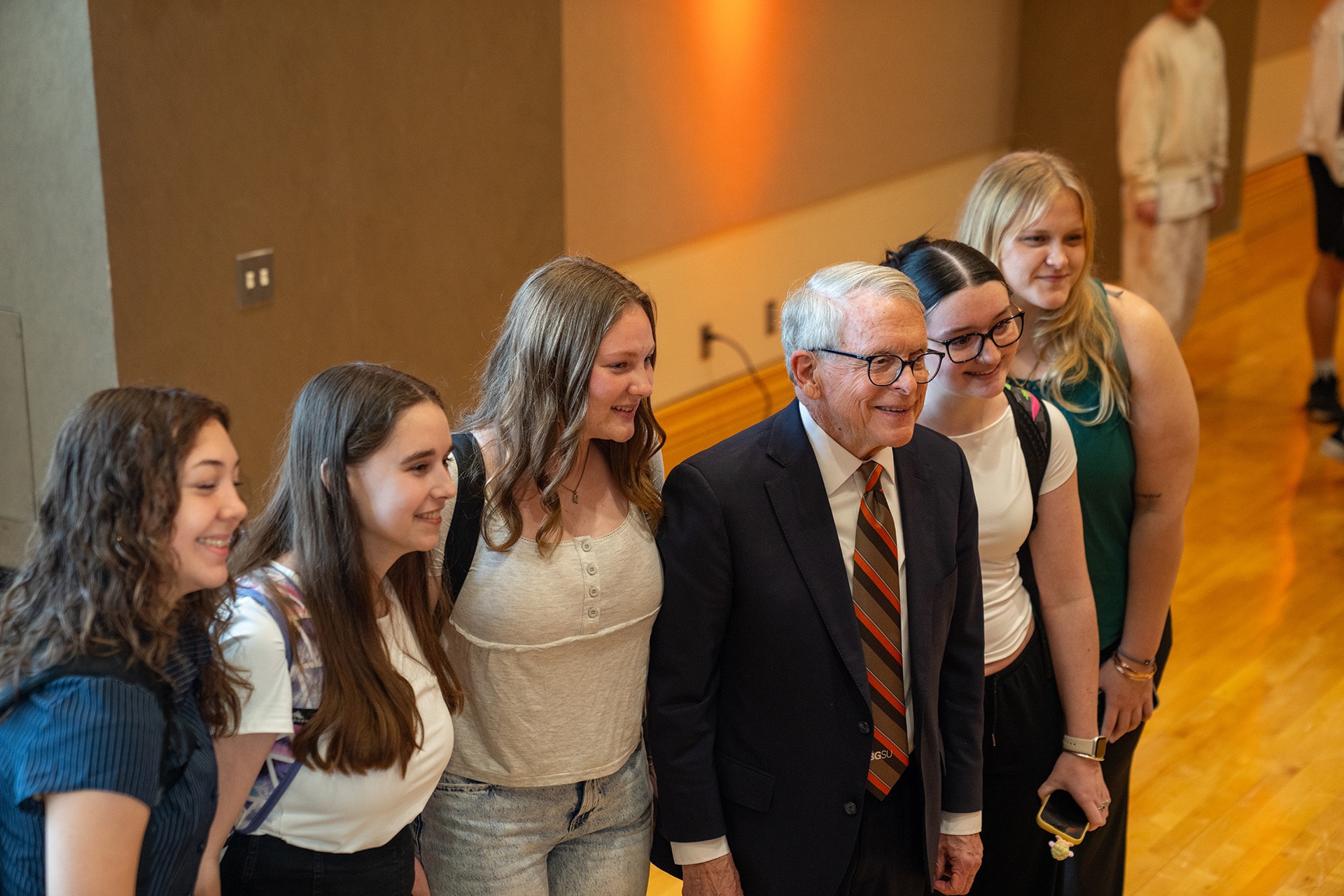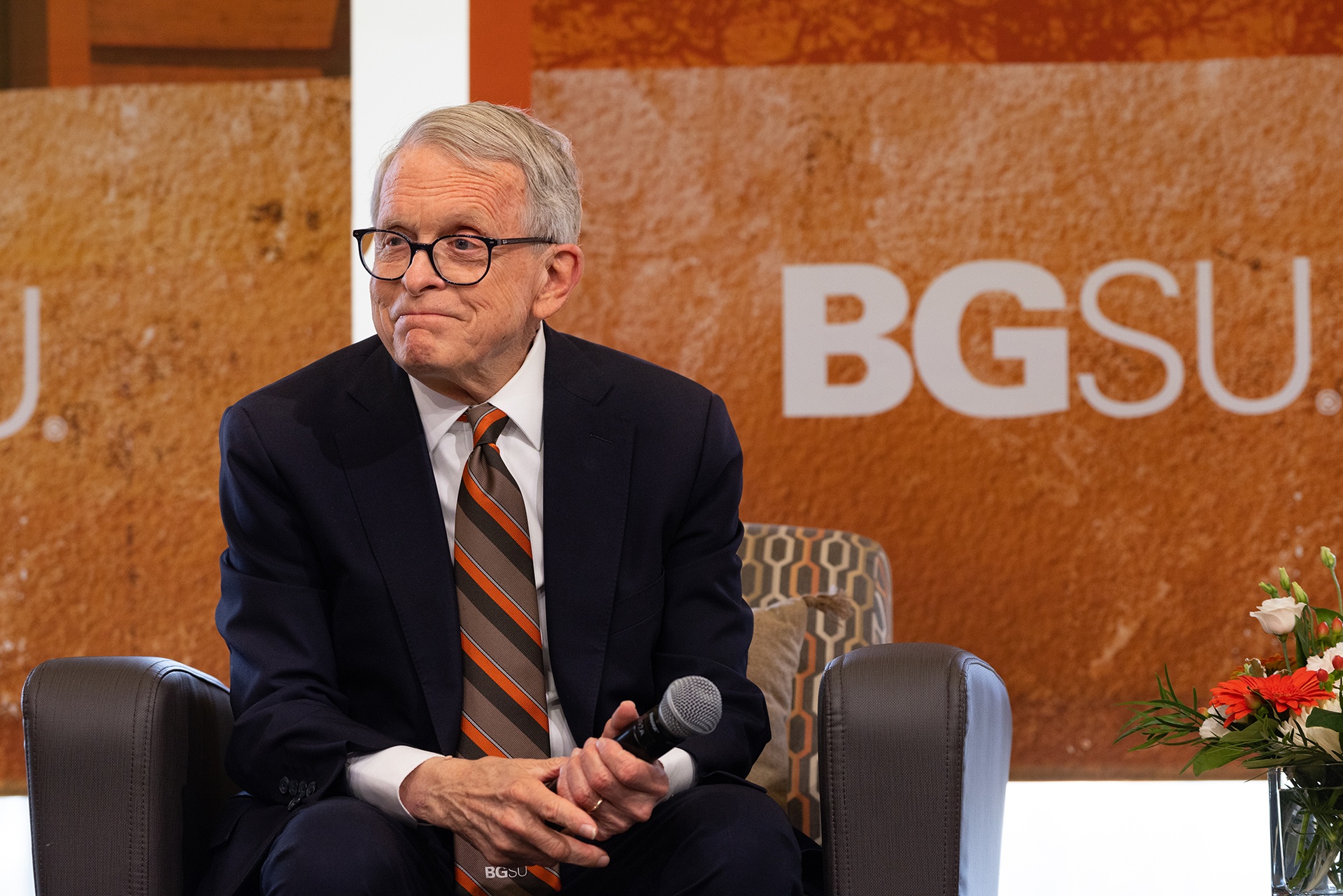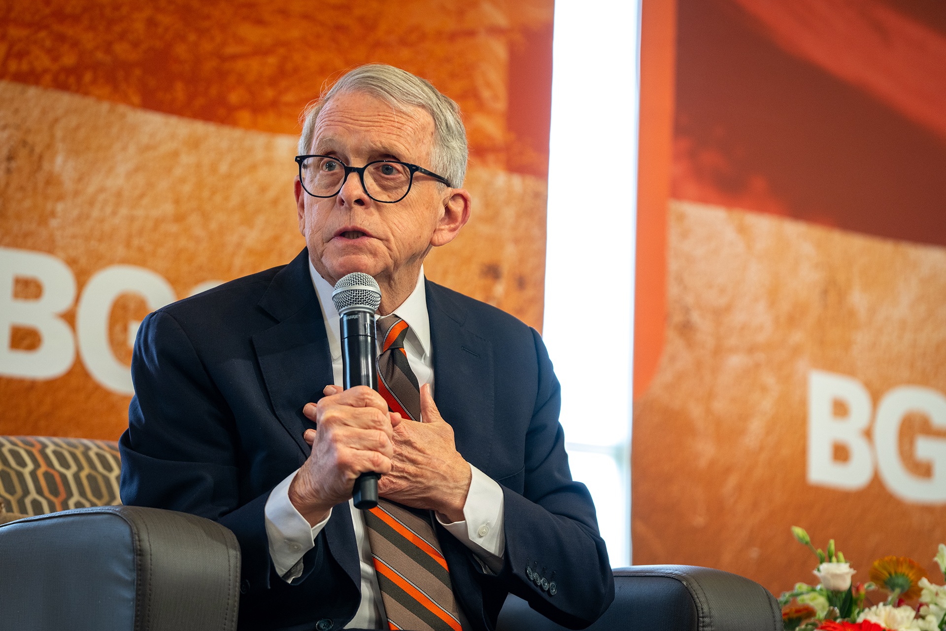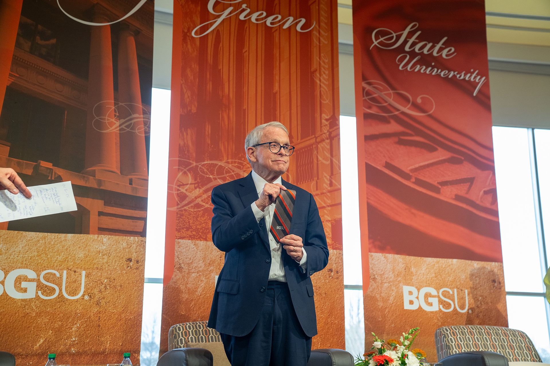 Ohio Gov. Mike DeWine spoke to a packed crowd at Bowling Green State University on April 14, sharing insight on leadership, democracy and the importance of dialogue as the first sitting governor to participate in the Democracy and Public Policy Network’s annual leadership luncheon.
