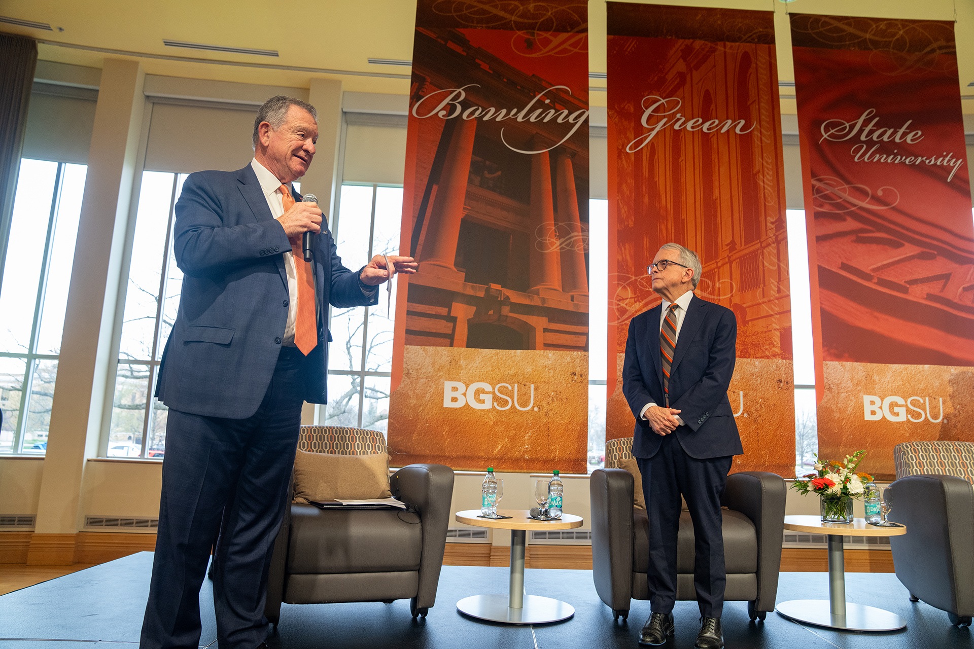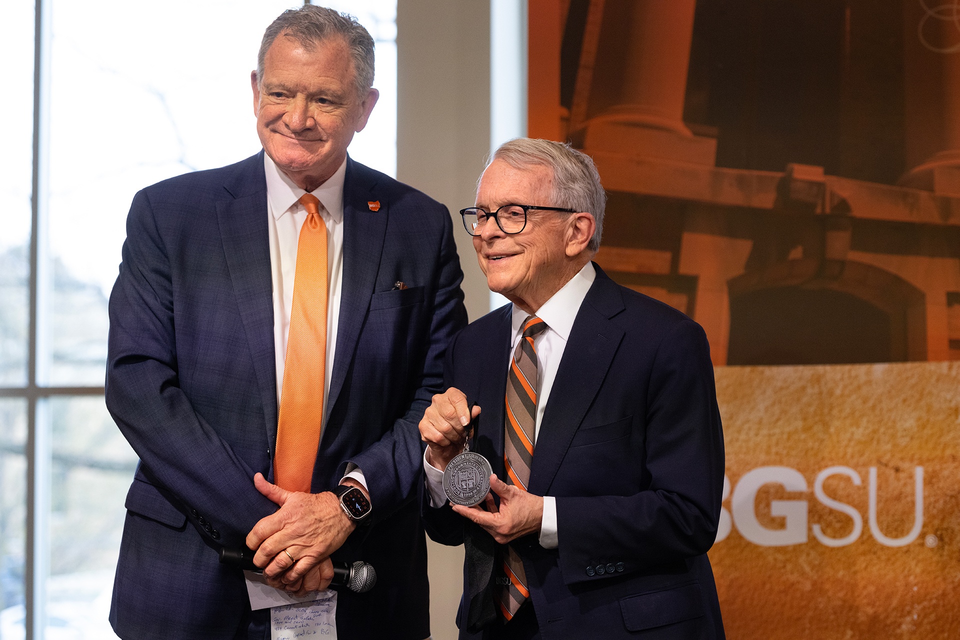 BGSU President Rodney K. Rogers presented DeWine with the University’s President’s Award for Public Good in recognition of his dedication to public service and the impact he’s made on Ohio’s communities and its people.
