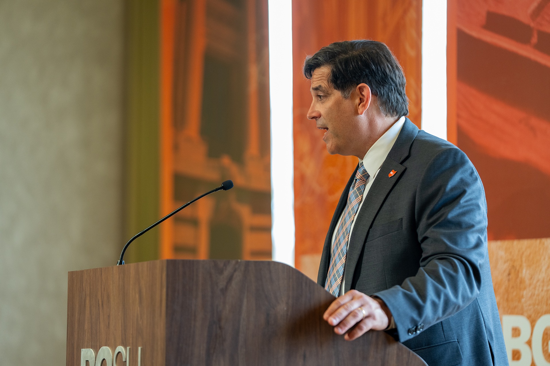 Ohio Gov. Mike DeWine shows off his BGSU tie while on stage at the leadership luncheon.