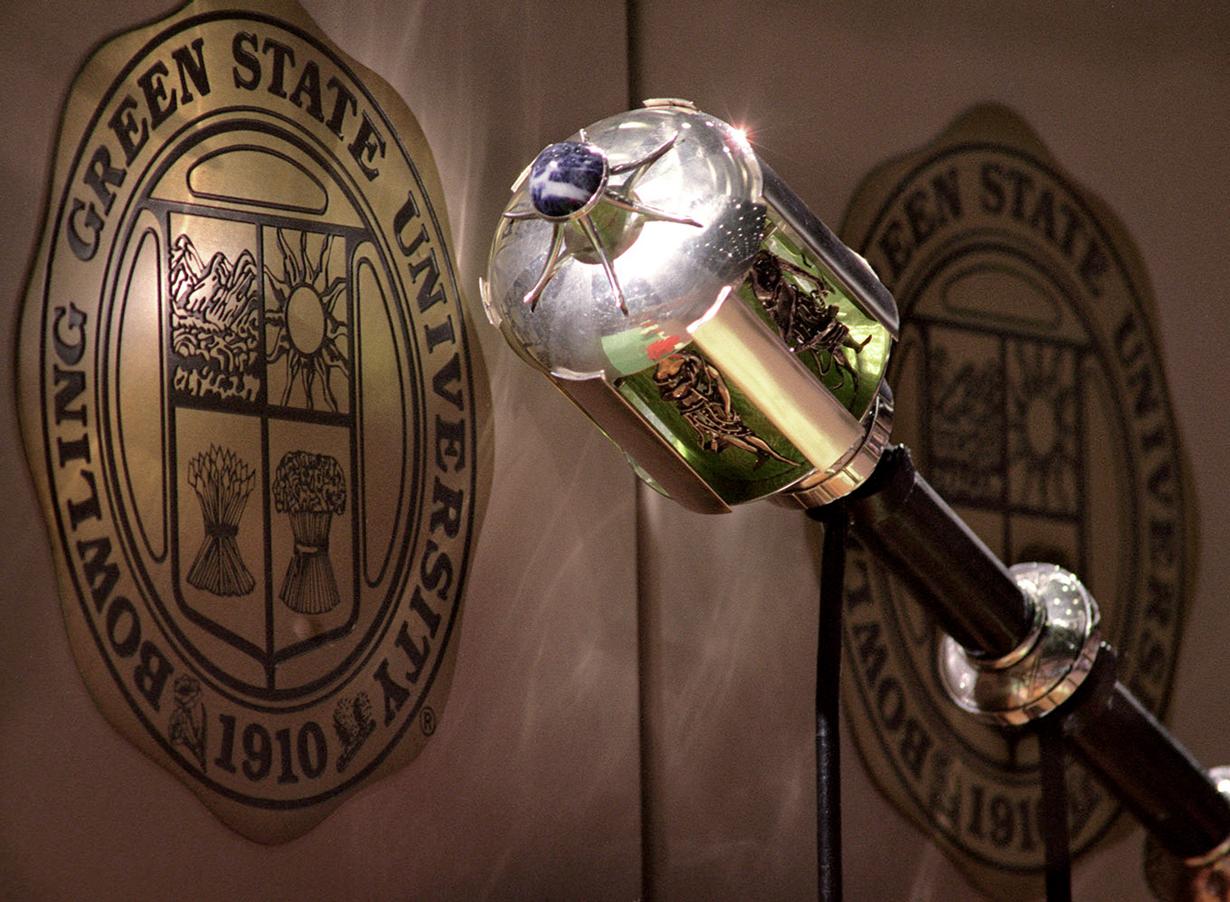 The Mace, used as a weapon in medieval times, is employed today on many university campuses as a symbol of office. The Mace of the President of Bowling Green State University bears symbols and figures representing three related categories of human culture: areas of learning, the vicissitudes of culture, and the waxing and waning of human life.